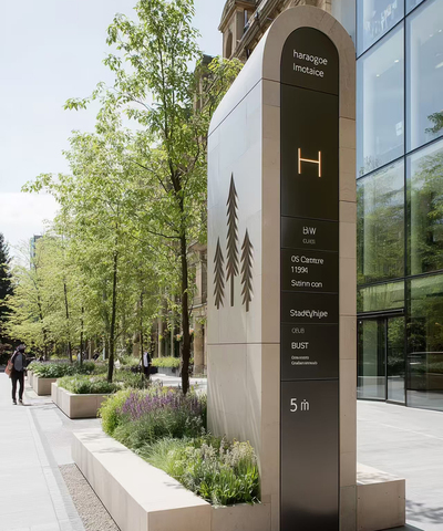 Letrero colgante moderno para señalización de pilón exterior resistente al agua personalizado con marco de acero/aluminio y fuente de luz LED